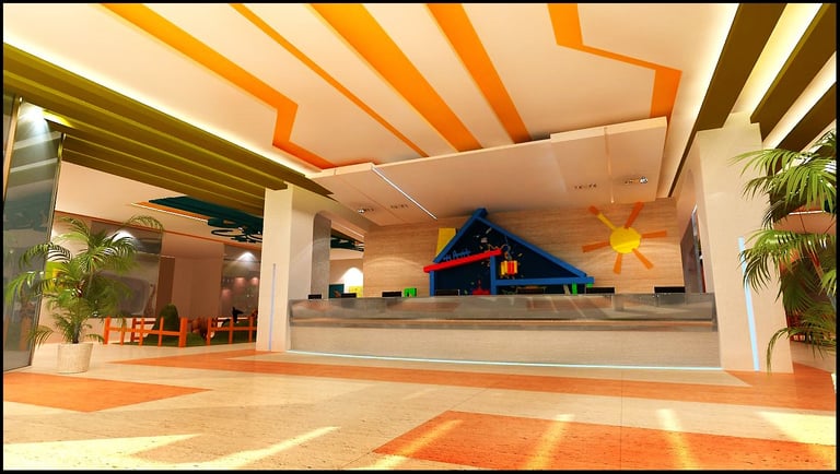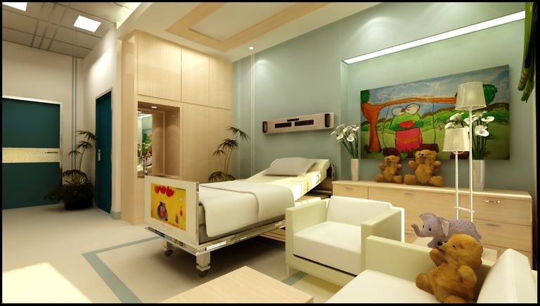 تم تصميم مفهوم مستشفى الأطفال بإنشاء تصميم داخلي يوفر بيئة مريحة ومرحة للأطفال وعائلاتهم. يتميز التصميم بعناصر الطبيعة مثل الأشجار والزهور والحيوانات والميزات المائية لخلق جو هادىء. تتكون لوحة الألوان في المقام الأول من اللون الأخضر الناعم والأزرق والألوان الترابية ، مع لمسات من الألوان الزاهية والمبهجة لخلق بيئة مرحة ومرحبة
